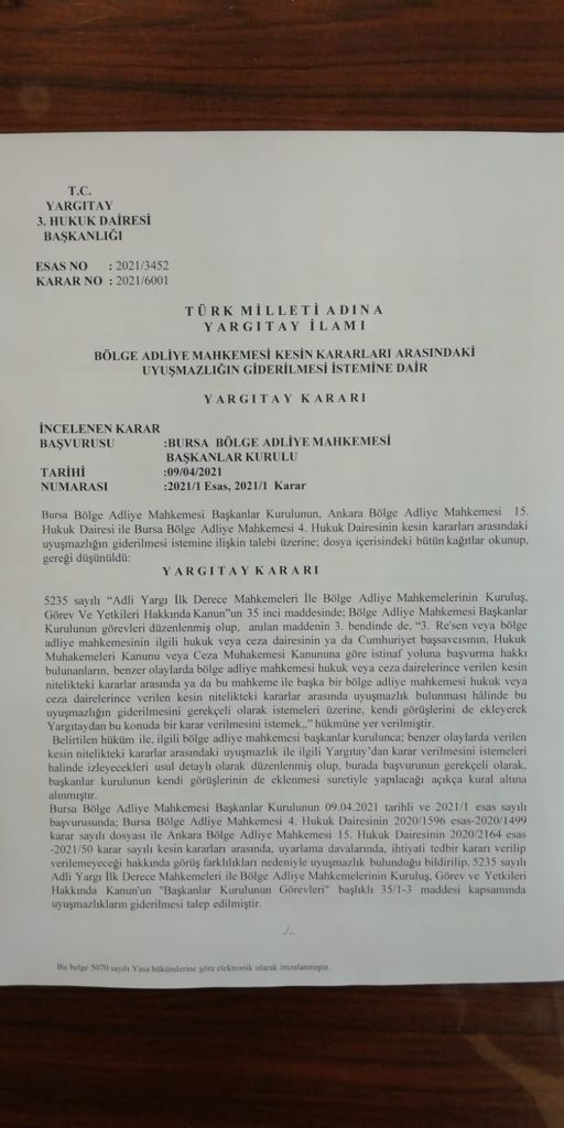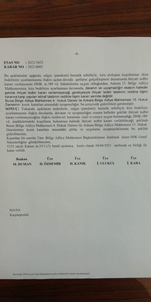 Bursa Bölge Adliye Mahkemesi 4. Hukuk Dairesi ile Ankara Bölge Adliye Mahkemesi 15. Hukuk Dairesi’nin benzer olayda verdikleri kesin nitelikteki karar arasında yaşanan uyuşmazlığı ele alan Yargıtay 3. Dairesi, salgın (pandemi) hastalık sebebiyle kira bedelinin uyarlanmasına ilişkin davalarda, davanın ve uyuşmazlığın esasını halleder şekilde ihtiyati tedbir kararı verilemeyeceğine ilişkin verilen ret kararının usul ve yasaya uygun bulunmadığı, HMK 389 vd. maddelerindeki koşulların bulunması halinde ihtiyati tedbir kararı verilebileceği; şeklinde Bursa Bölge Adliye Mahkemesi 4. Hukuk Dairesi ile Ankara Bölge Adliye Mahkemesi 15. Hukuk Dairelerinin kesin kararları arasındaki görüş ve uygulama uyuşmazlıklarının giderilmesine karar verdi.