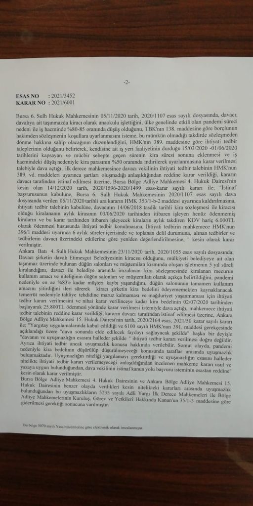 Uyuşmazlığın oluşmasına neden olan diğer olay ise Ankara Etimesgut’ta yaşandı. Etimesgut Belediyesi’nin kiracısı olan ve düğün salonu işleten davacı, pandemi nedeniyle en az %83’e kadar müşteri kaybı yaşadığını, düğün salonunun tamamen kullanım amacını yitirdiğini ileri sürerek kiracı şirketin kira bedelini ödeyememekten kaynaklanacak temerrüt nedeniyle tahliye tehdidine maruz kalmaması ve mağduriyet yaşanmaması için ihtiyati tedbir kararı verilmesi için Ankara Batı 4. Sulh Hukuk Mahkemesi’ne başvurdu. Mahkeme ise davacının ihtiyati tedbir kararının reddine karar verdi. Davacının kararı istinaf etmesi üzerine Ankara Bölge Adliye Mahkemesi 15. Hukuk Dairesi, alt mahkemenin kararını onaylayıp, davacının ihtiyati tedbir kararı isteminin esastan reddine karar verdi.