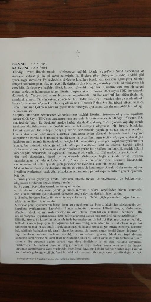 Yargıtay 3. Hukuk Dairesi, Covid-19 sebebiyle esnafın kira bedelini karşılayamaması hususunda, TBK 138 ve HMK 391 gerekçesiyle açılan uyarlama davasında, somut olayın gereklerine göre kira bedelinin indirimi konulu ihtiyati tedbir kararı verilebileceğine hükmetti.