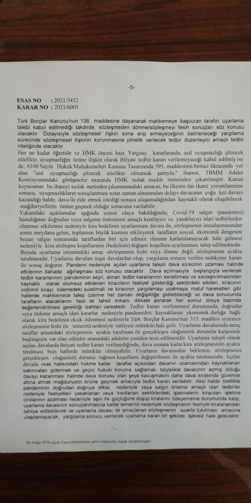 Kayseri Barosu Avukatı Seyit Halil Yüzgeç, verilen kararın Bursa Bölge Adliye Mahkemesi 4. Hukuk Dairesi ile Ankara Adliye Mahkemesi 15. Hukuk Dairesi’nin uyuşmazlık göstermesi üzerine alındığını söyledi. Bursa’daki olayda, davalıya ait taşınmazda kiracı olarak anaokulu işleten davacının pandemi nedeniyle iş hacminde %80-85 oranında düşüş olduğunu gerekçe göstererek, Bursa 6. Sulh Hukuk Mahkemesi’ne HMK 389. Maddesine göre ihtiyati tedbir talebinde bulundu. Talepte, pandemi döneminde işyeri faaliyetlerinin durduğu tarihler arasını kapsayan ve mücbir sebepte geçen sürenin kira süresi sonuna eklenmesi ve iş hamindeki düşüş nedeniyle kira parasının %50 oranında indirilerek uyarlanması için dava açtı. Mahkemenin davayı reddetmesi üzerine davacı Bursa Bölge Adliye Mahkemesi’ni istinaf etti. Bursa Bölge Adliye Mahkemesi 4. Hukuk Dairesi ise davacıyı haklı bularak ihtiyati tedbir talebinin 6 aylık süreler içerisinde ve toplanan delil durumuna göre kabulüne karar verdi.